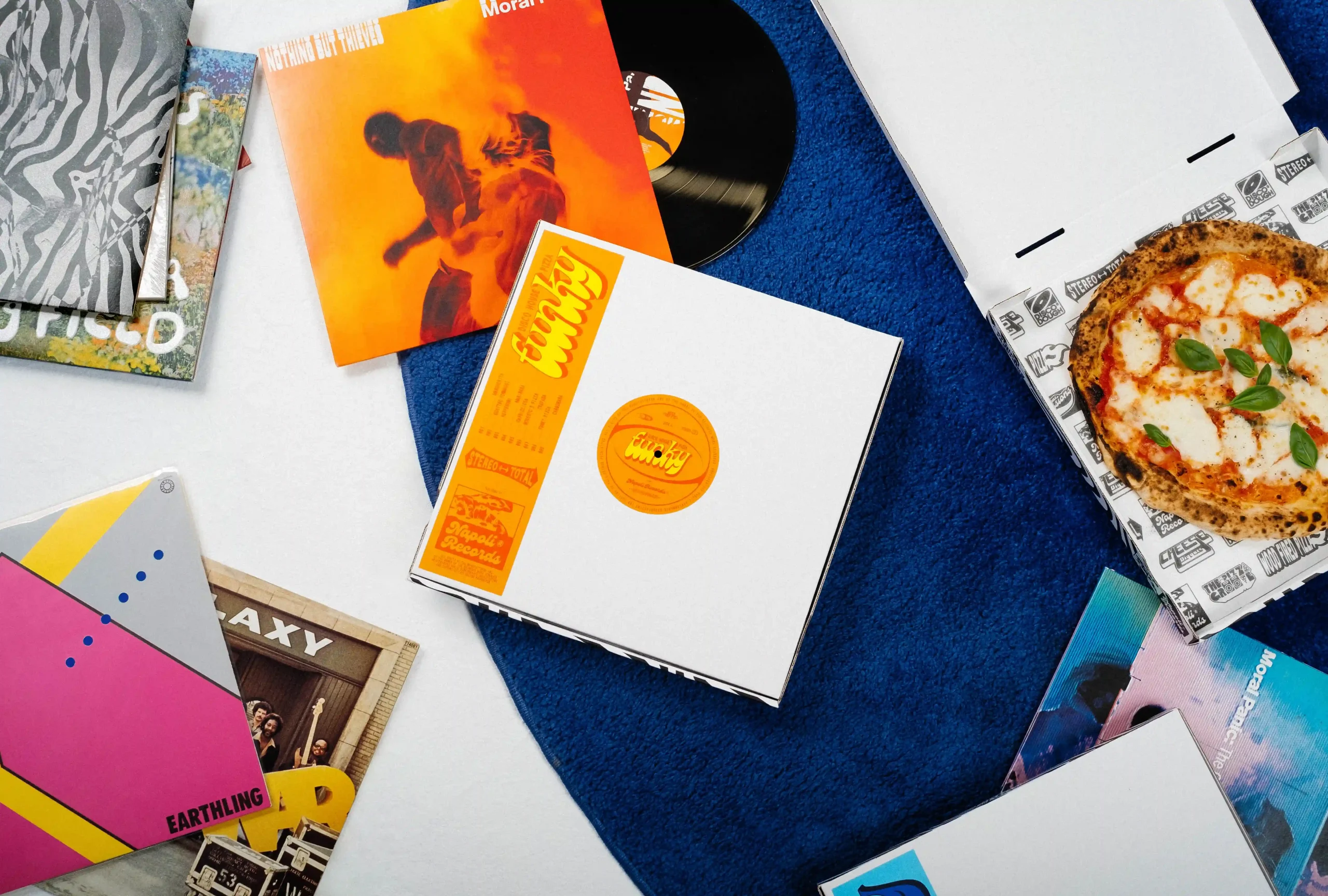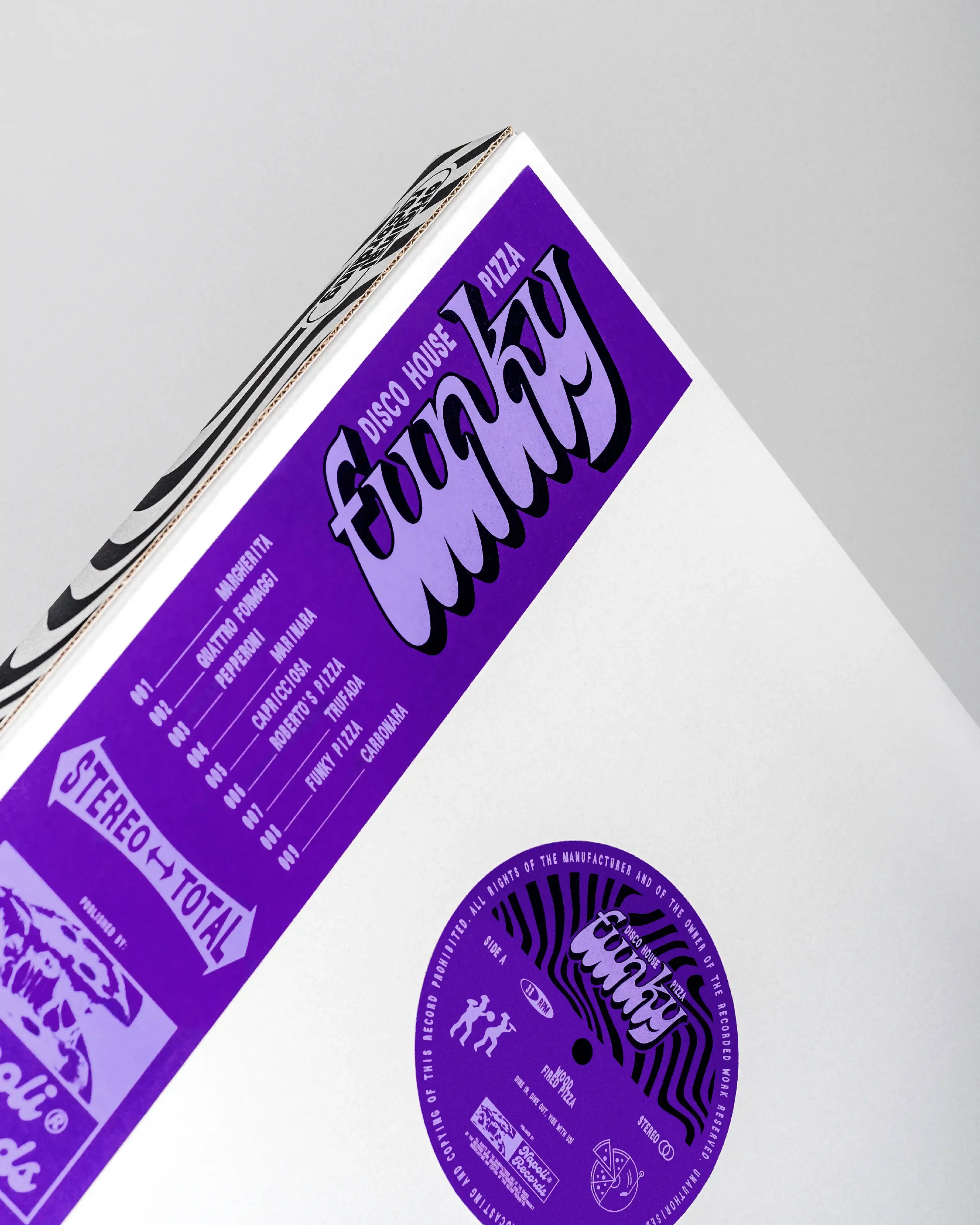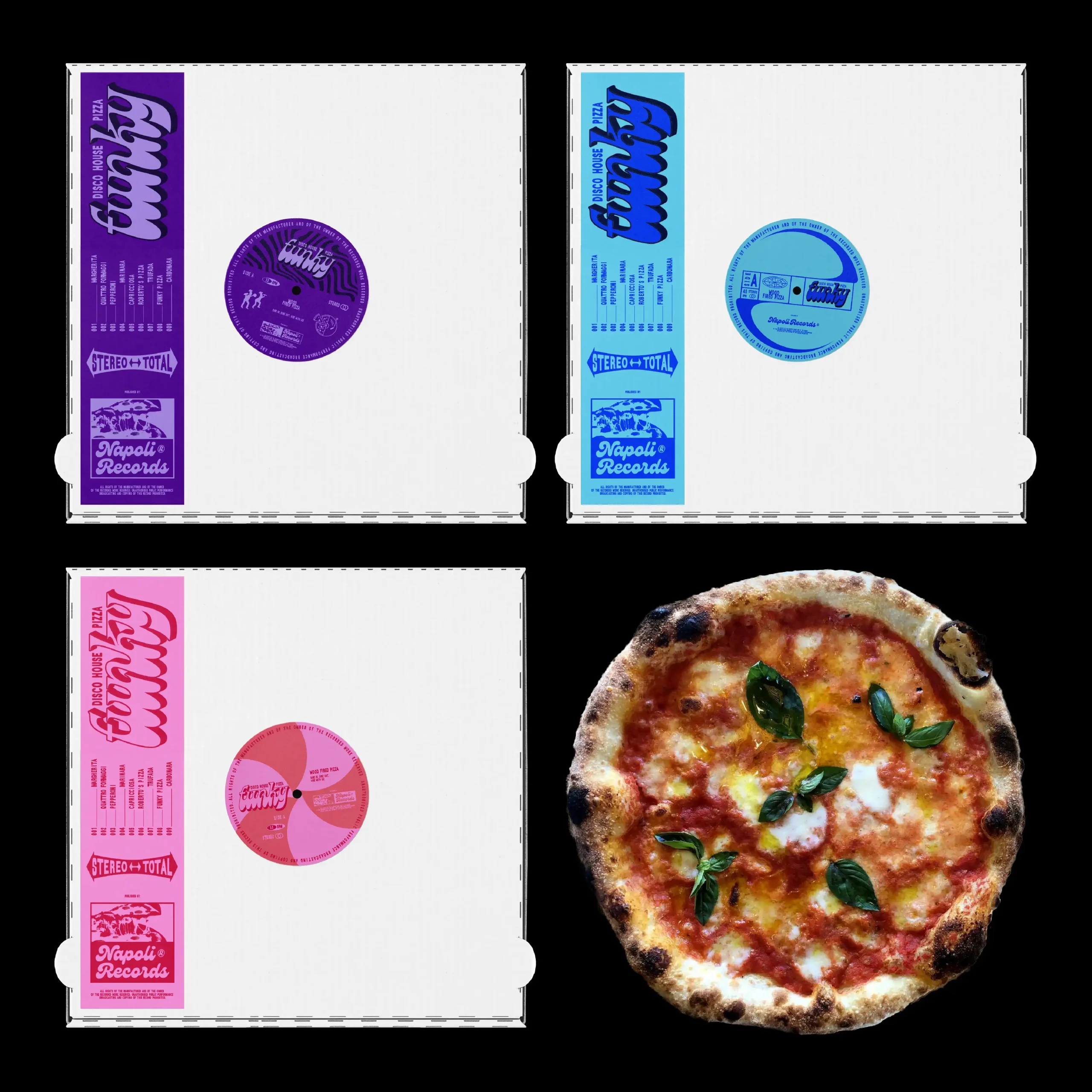 A graphic system inspired by vinyl culture and record labels was designed, adapted to the world of pizza and Italian essence. The identity was applied to the boxes, conceived as vinyl record sleeves, replicating their aesthetic both in format and graphics. Retro typefaces, compositions and graphic elements evoke album covers, alongside logos that reinterpret the visual codes of record labels.