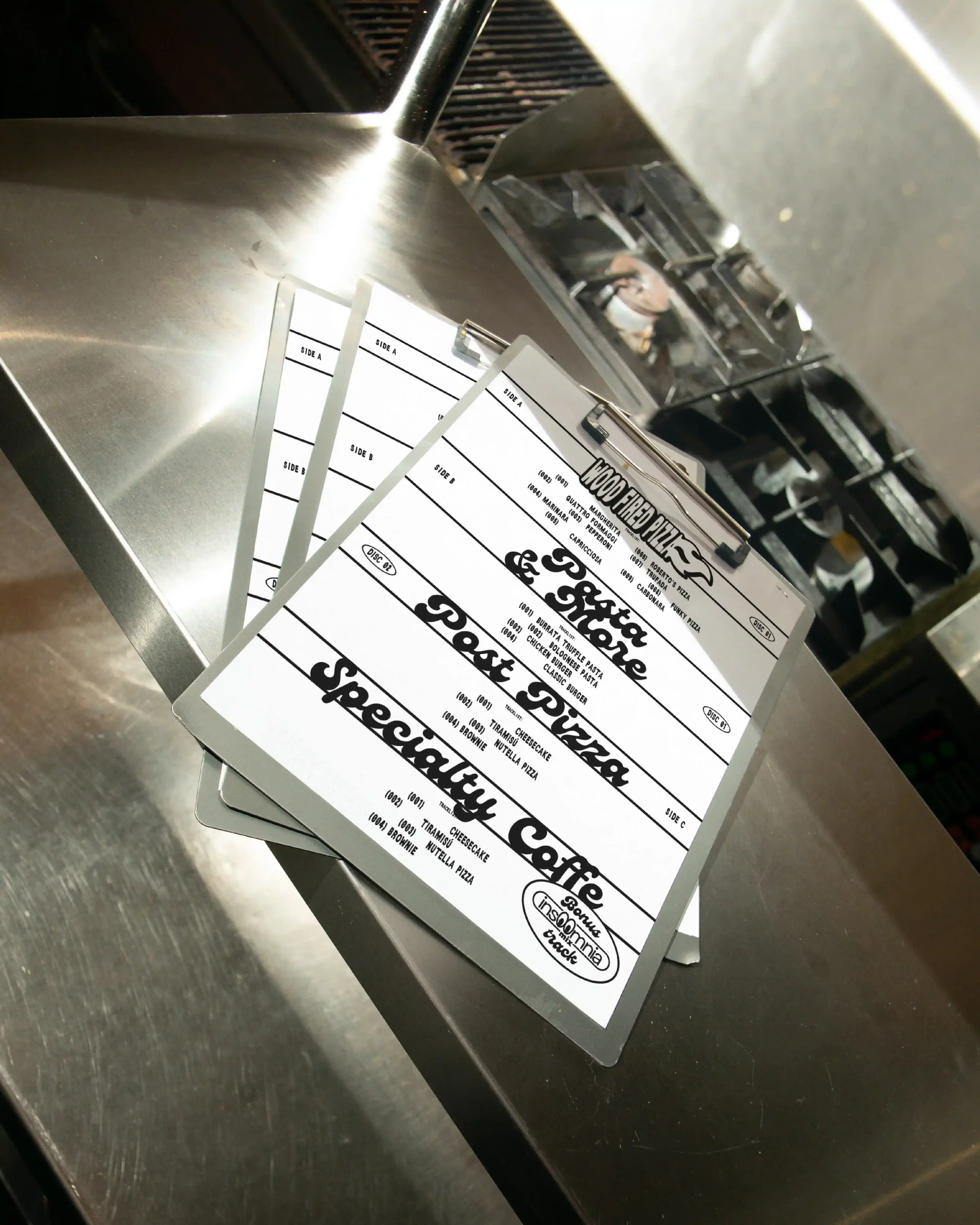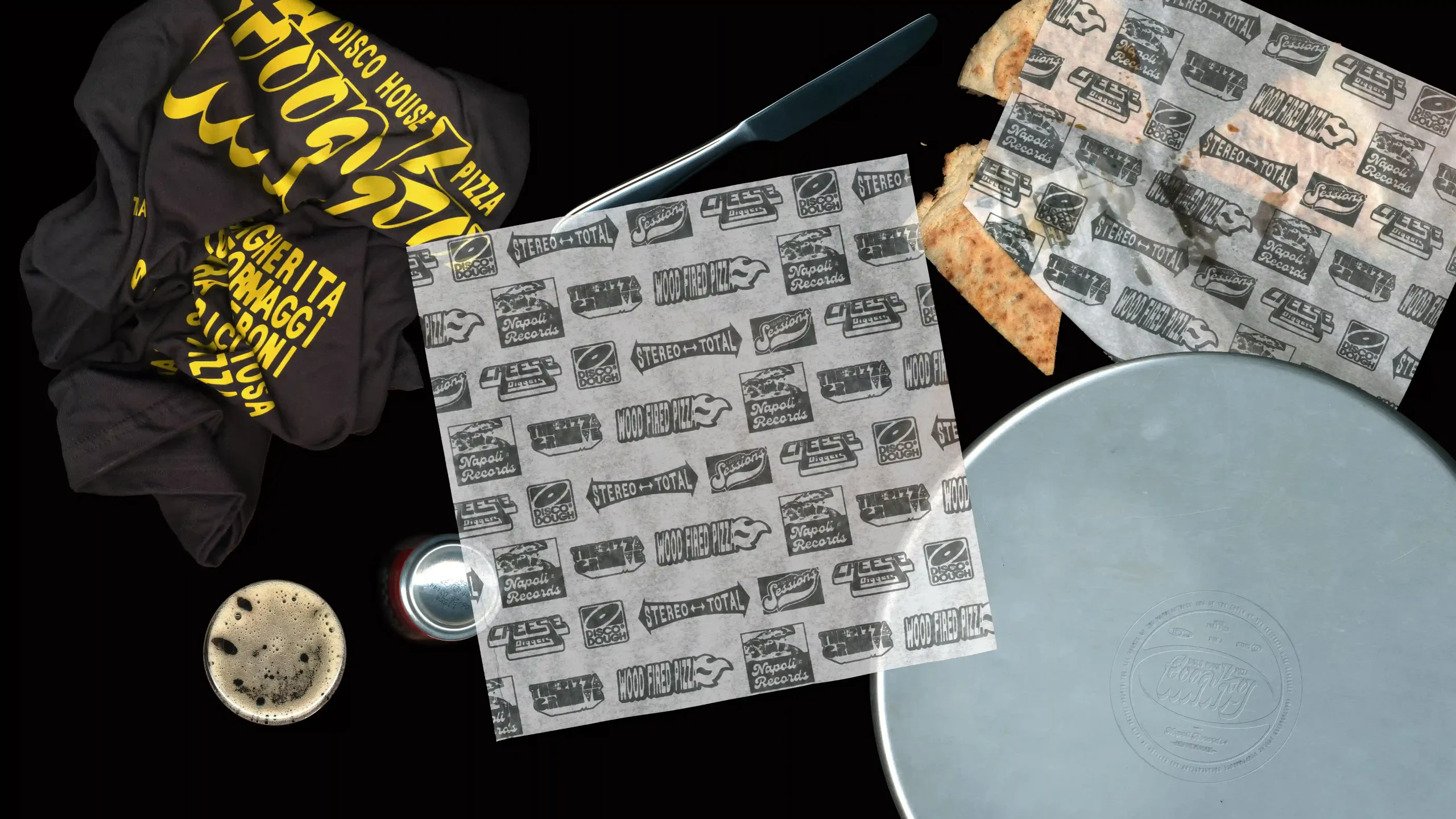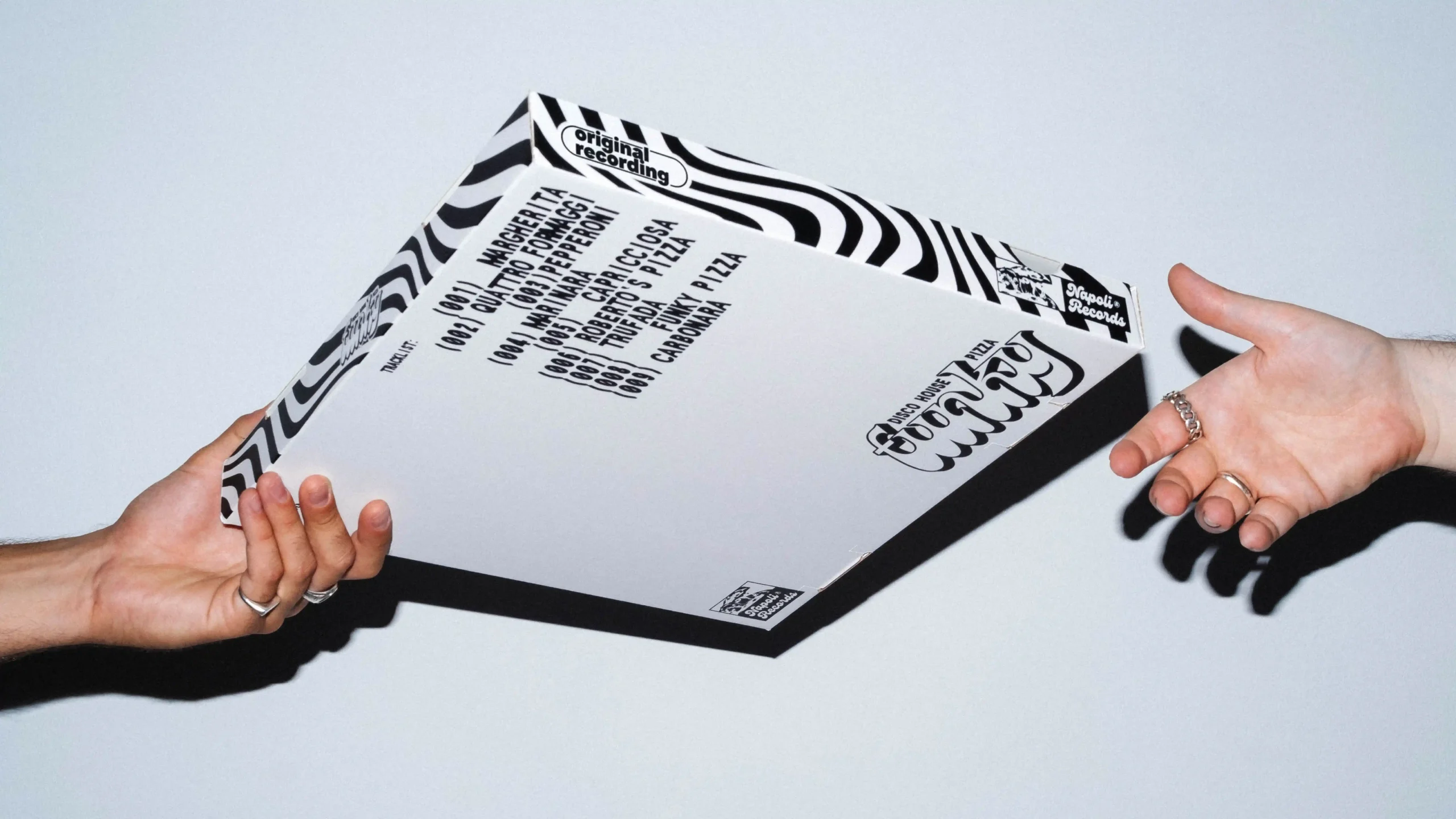 A graphic system inspired by vinyl culture and record labels was designed, adapted to the world of pizza and Italian essence. The identity was applied to the boxes, conceived as vinyl record sleeves, replicating their aesthetic both in format and graphics. Retro typefaces, compositions and graphic elements evoke album covers, alongside logos that reinterpret the visual codes of record labels.